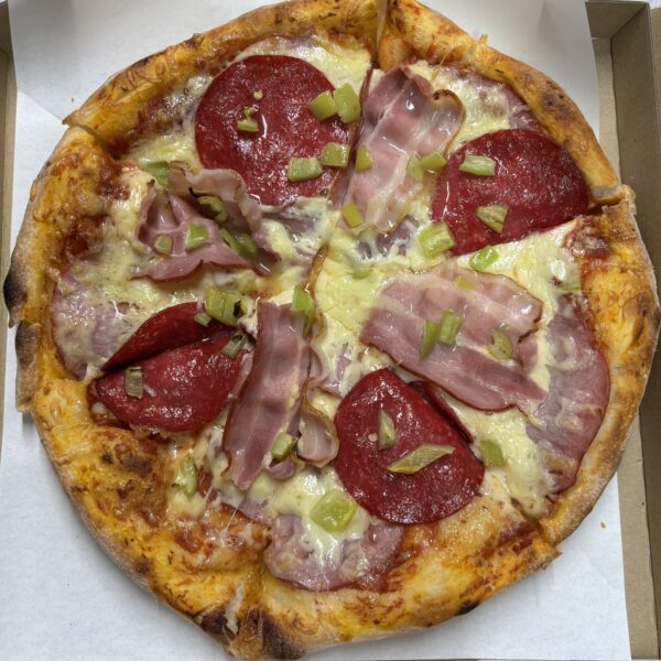 paradicsomos erős alap, füstölt sajt, tarja, bacon, szalámi, sonka, erős paprika, lilahagyma. 3 vagy több db 28cm-es pizza rendelése esetén minden pizza 2850ft/db és 1L-es választható ízű pepsi üdítőt adunk ajándékba, a készlet erejéig, 3pizzánként! A termék részletes leírása, a napi menü alá feltöltött szórólapunkon megtalálható! Online rendelés esetén a választandó üdítő tipusát (Pepsi Cola, Pepsi Max, Mirinda, 7up) írja be a megjegyzés rovatba! Amennyiben módunkban áll, teljesítjük! Készlet hiány esetén 1Les Pepsi üdítőt viszünk mindenkinek!   A kép csak illusztráció