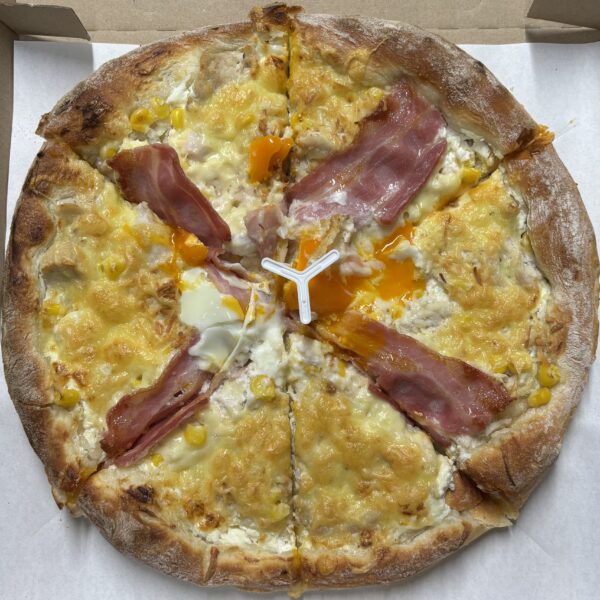 tejfölös alap, füstölt sajt, csirkehús, kukorica, tükörtojás, bacon A kép csak illusztráció