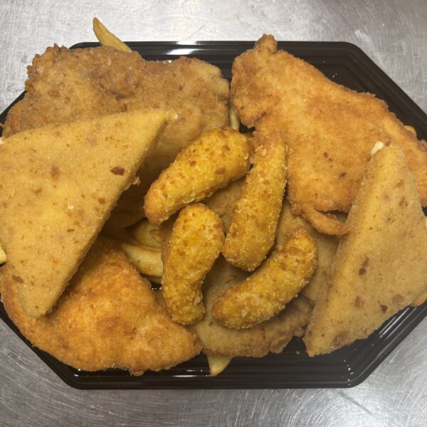 Rántott sertés karaj (2db), Rántott trapista sajt (2db), Rántott csirkemellfilé (2db), bundázott csirkemell csíkok, 2 adag steak burgonya, 1 adag savanyúság, maci szósz (2adag)