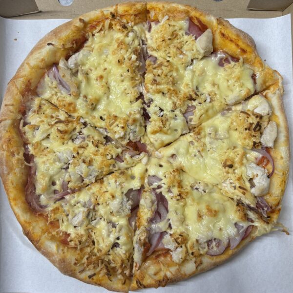 paradicsomos alap, füstölt sajt, sonka, tarja, csirkehús, lilahagyma